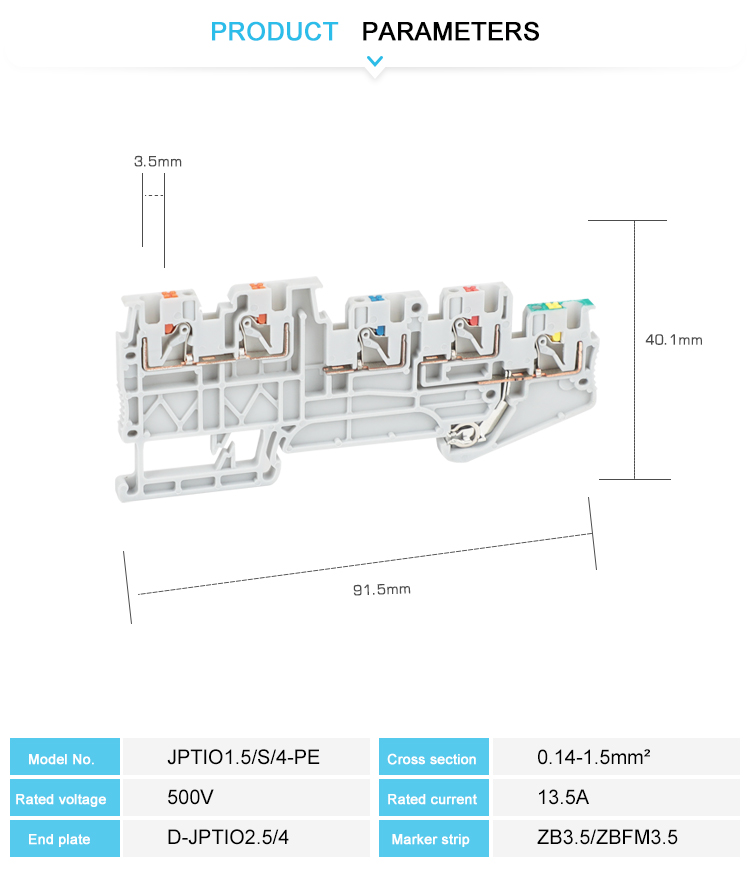 엔지니어링 난연제 나일론 PA66과 황동 나사 금속으로 제작. 엔지니어링 난연제 나일론 PA66과 황동 나사 금속으로 제작. 푸쉬-인 연결 단자대는 도구 없이 페룰 또는 단선이 있는 도체를 배선하는 것이 특징입니다. 콤팩트한 디자인과 전면 연결로 인해 제한된 공간에서 배선이 가능합니다. 이중 기능 샤프트의 테스트 시설 외에도 모든 단자대는 추가 테스트 연결을 제공합니다.Din 레일 NS 35에 설치할 수 있는 범용 풋이 있습니다. 두 개의 도체를 쉽게 연결하면 큰 도체 단면적도 문제가 되지 않습니다. 전위 분배는 터미널 중앙의 고정 브리지를 사용할 수 있습니다. 모든 유형의 액세서리: 엔드 커버, 엔드 스토퍼, 칸막이 플레이트, 마커 트립, 고정 브리지, 삽입 브리지 등