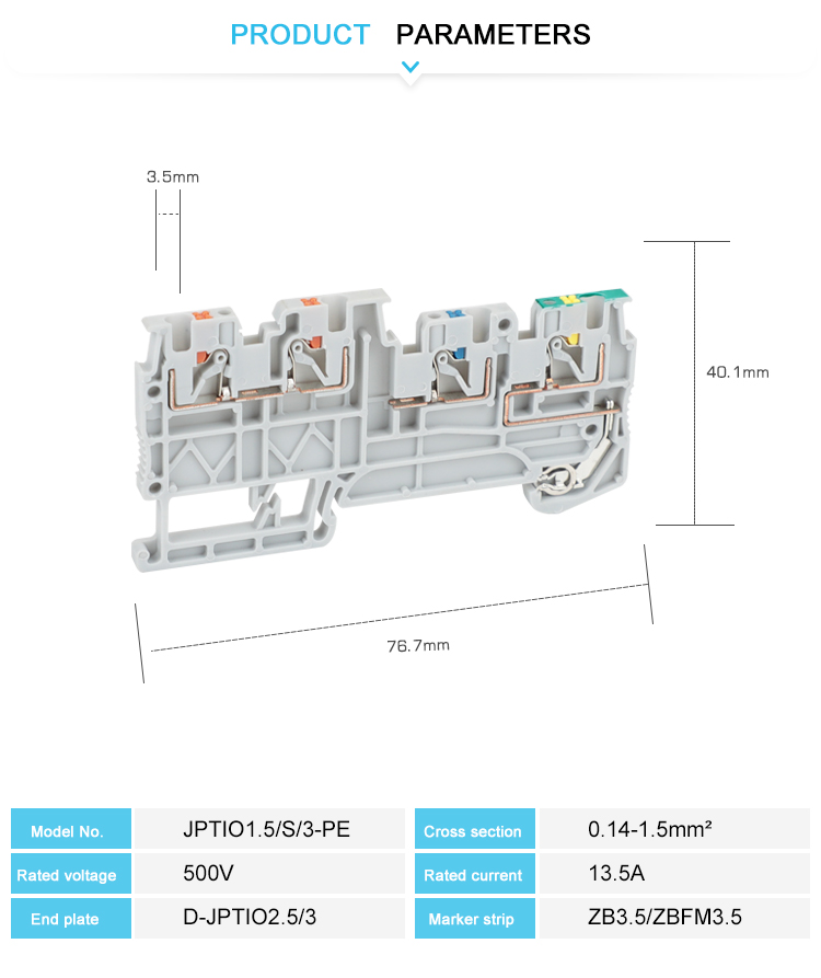 JPTIO1.5/S/3-PE 단자대 단자대는 난연성 나일론 PA66, 황동 도체 및 스테인레스 스틸 압축 스프링을 채택하여 열악한 작업 조건에서도 전기적 안전성과 기계적 강도를 보장합니다.